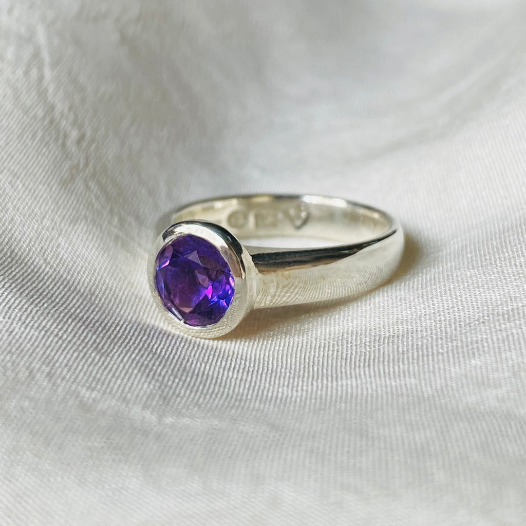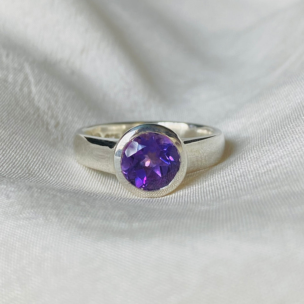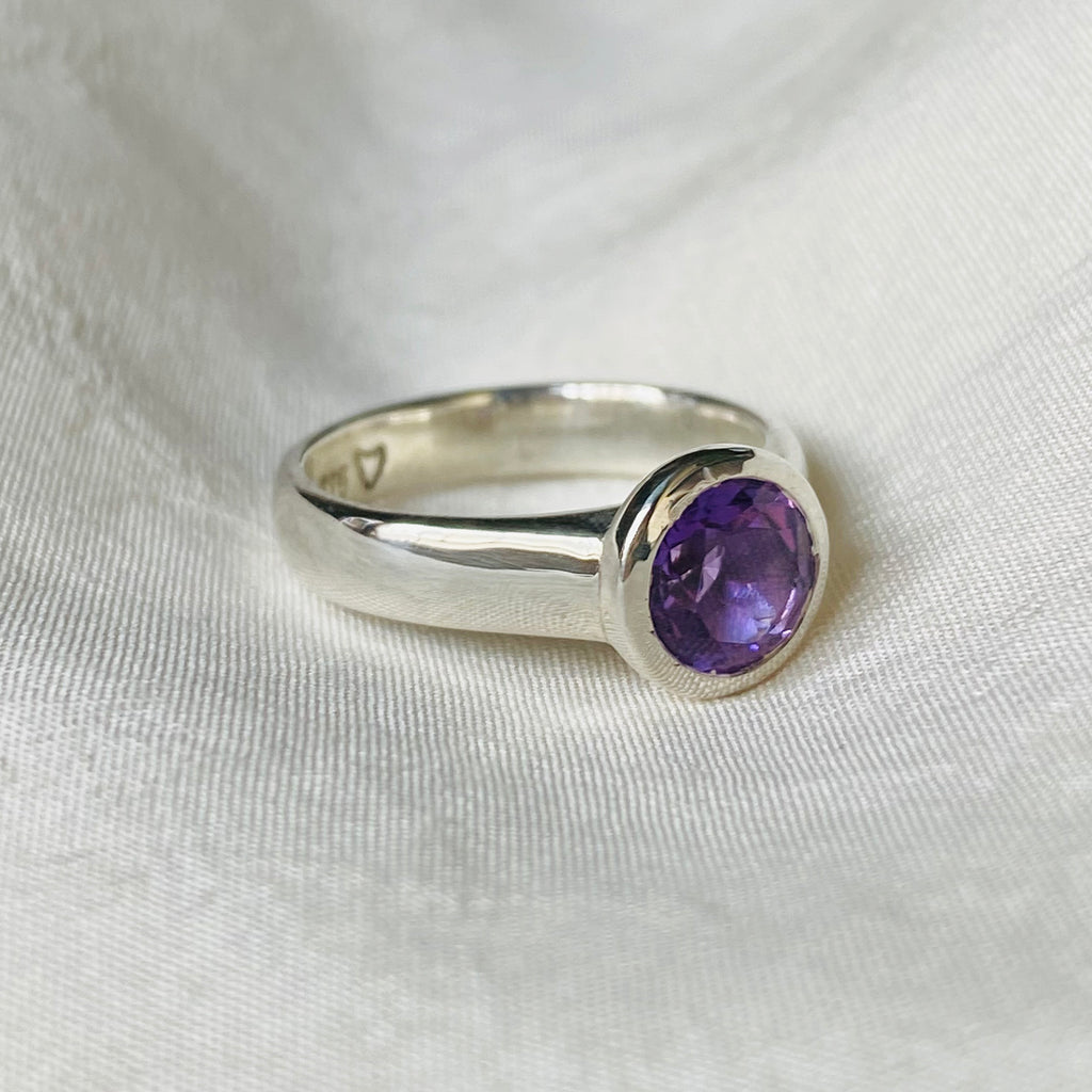 Beautiful simplicity. This ring features a beautiful round amethyst gemstone in a bezel setting.