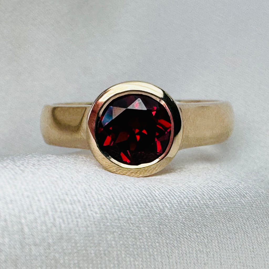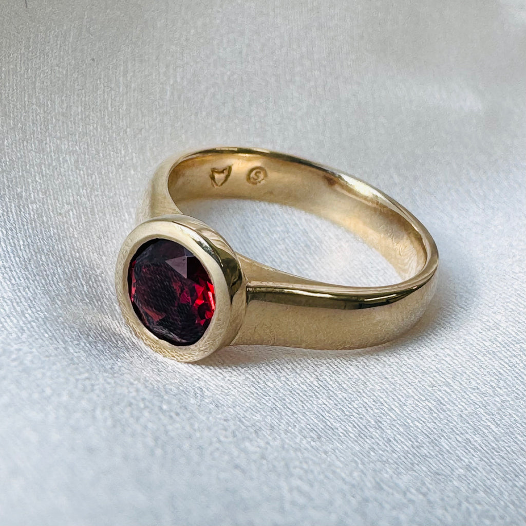 Beautiful simplicity. This ring features a beautiful round amethyst gemstone in a bezel setting.