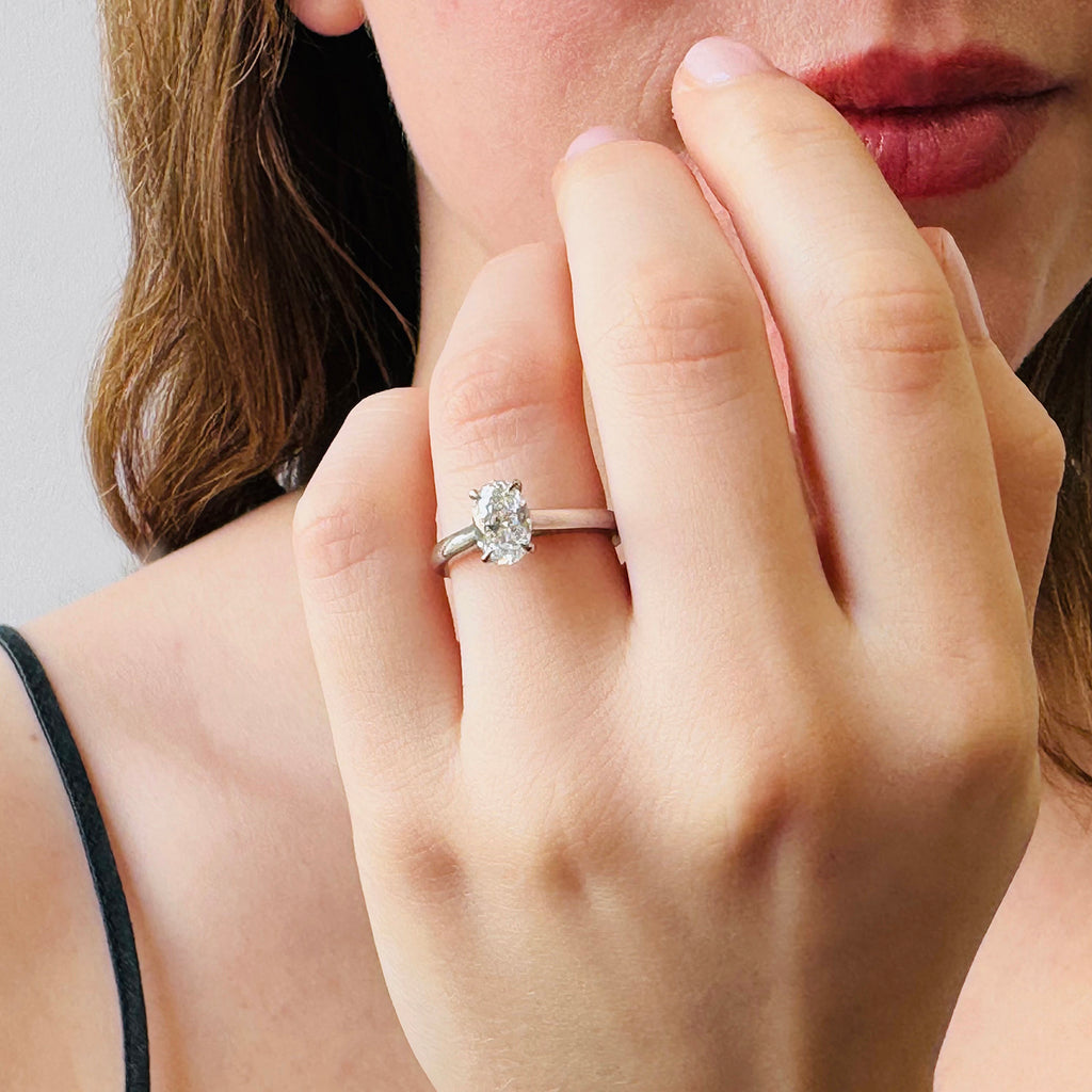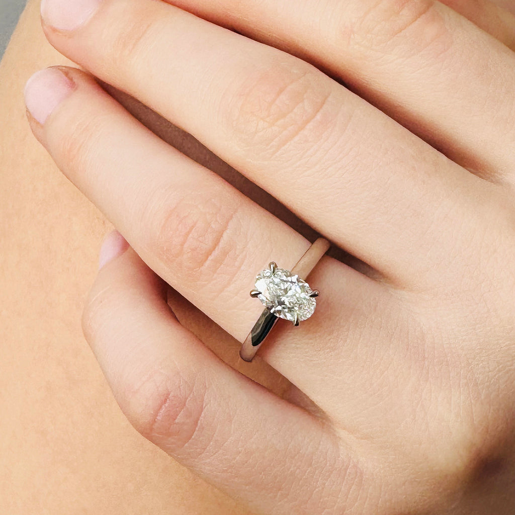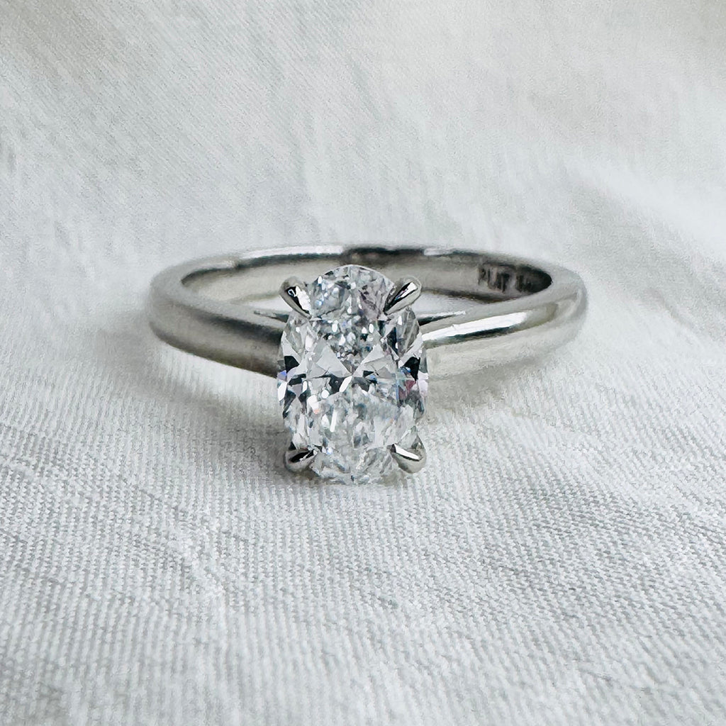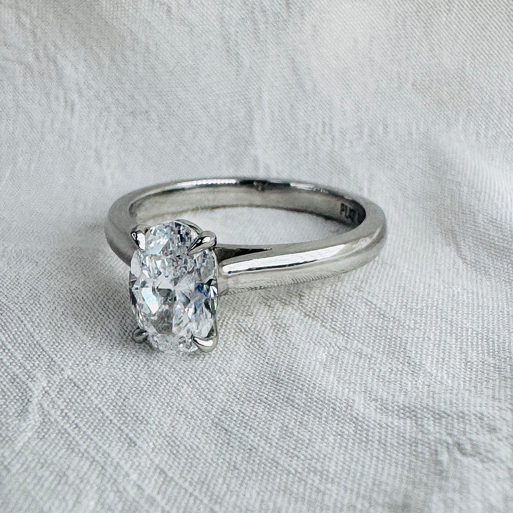 Hand-selected for its beauty and balance, the diamond is set in finely crafted platinum claws, designed to maximise light and showcase its natural brilliance. The slim, high-polish band features an elegant half-round profile, offering a refined and enduring silhouette.