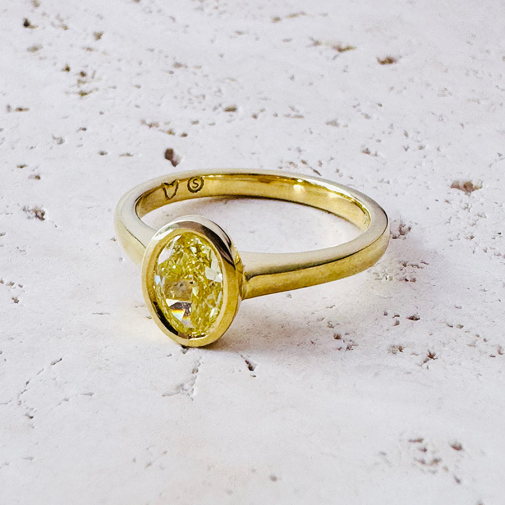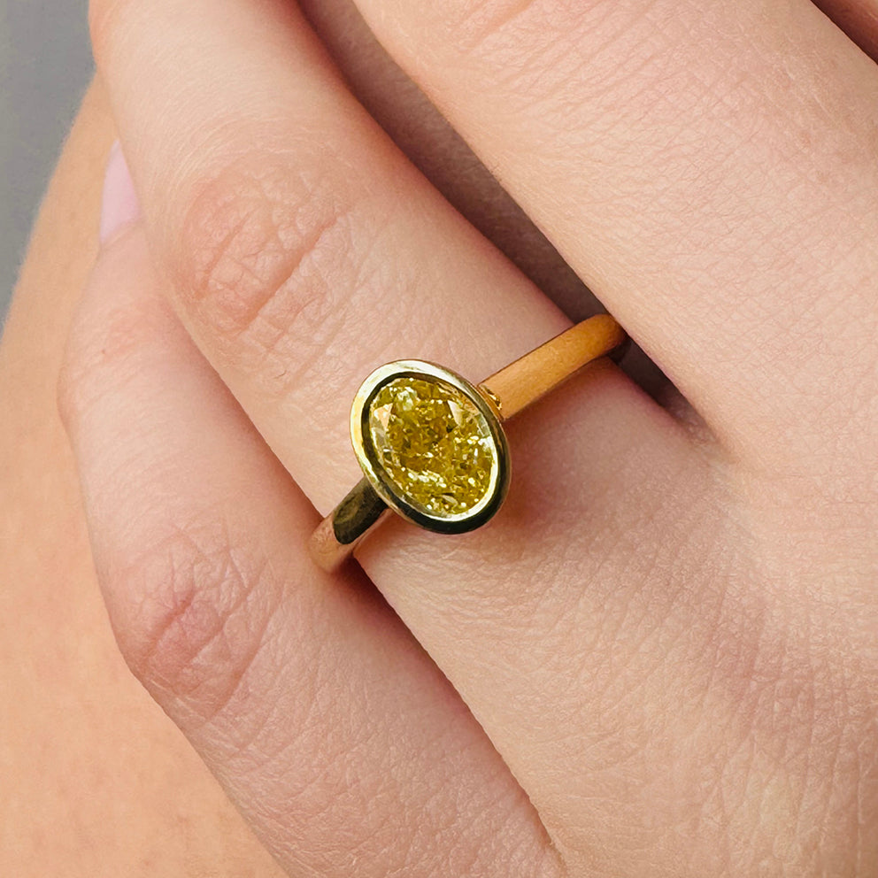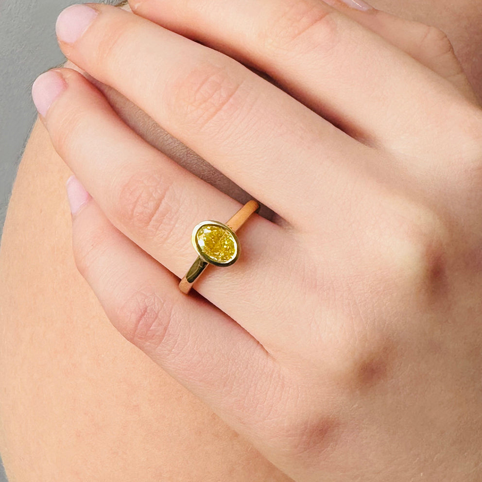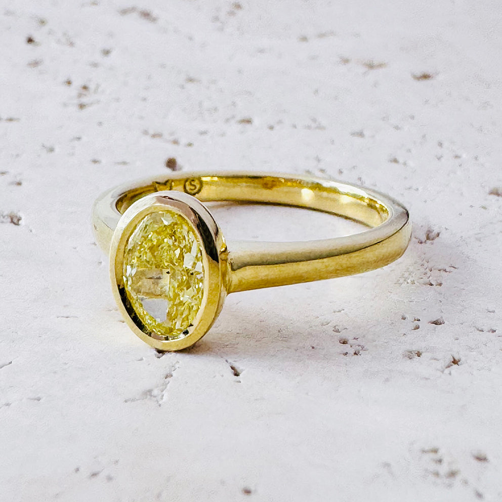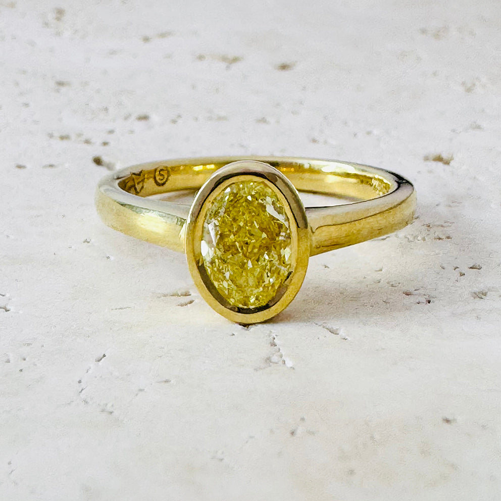 Crafted entirely in solid 18ct yellow gold, the sleek bezel setting enhances the diamond’s natural warmth while offering superior protection for everyday wear. Clean, modern, and timeless—this is a ring designed to last a lifetime.