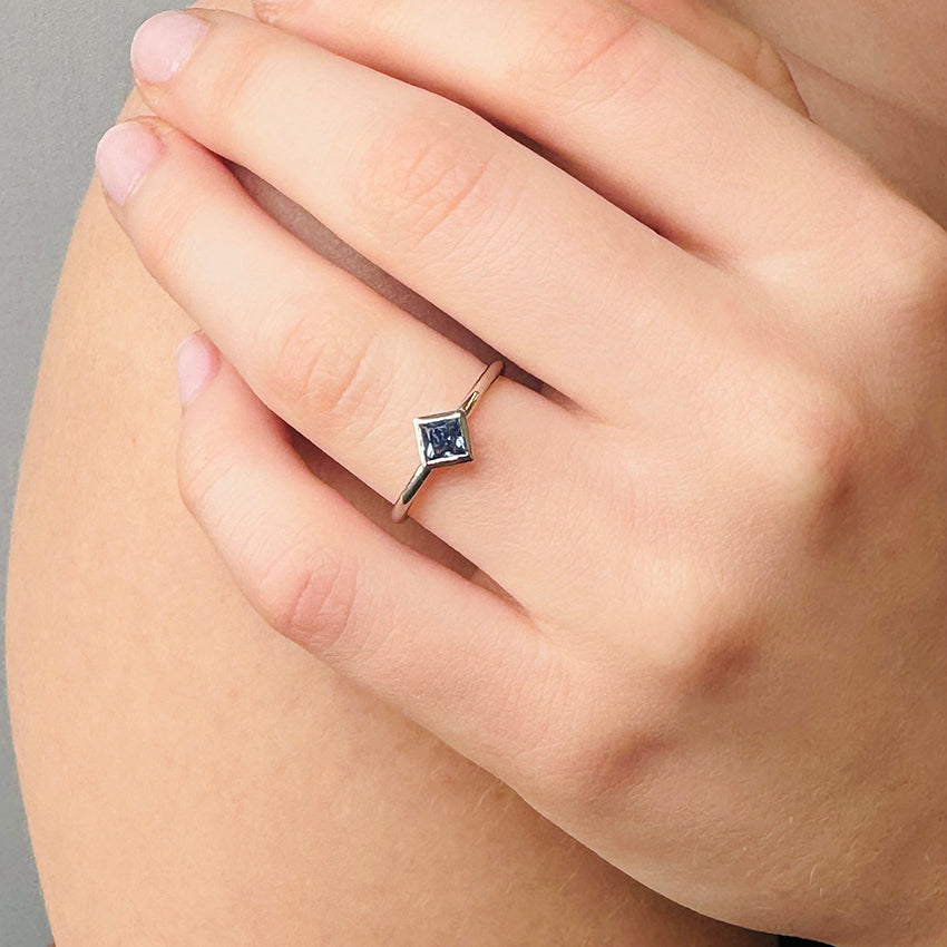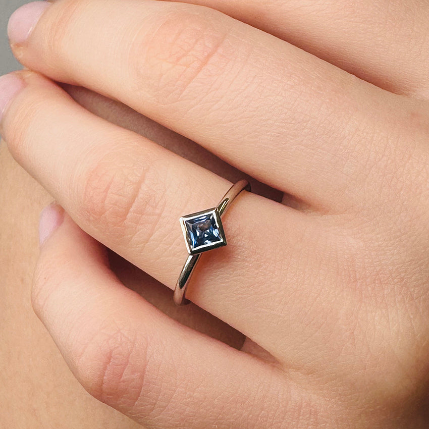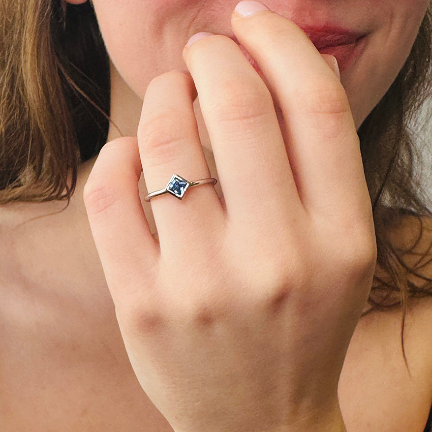 Perfect in its simplicity, this delicate ring features a princess cut sapphire gemstone bezel set in platinum, on a solid platinum band.