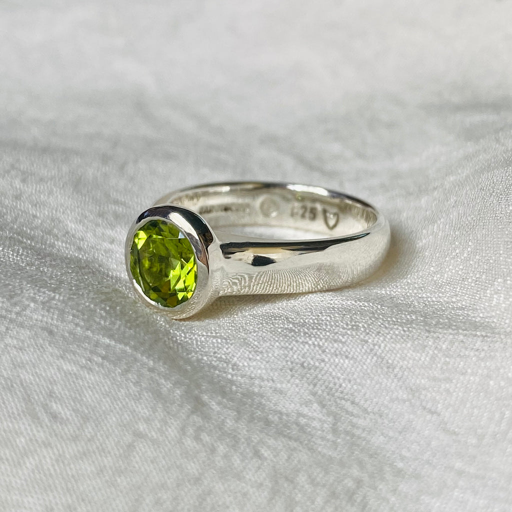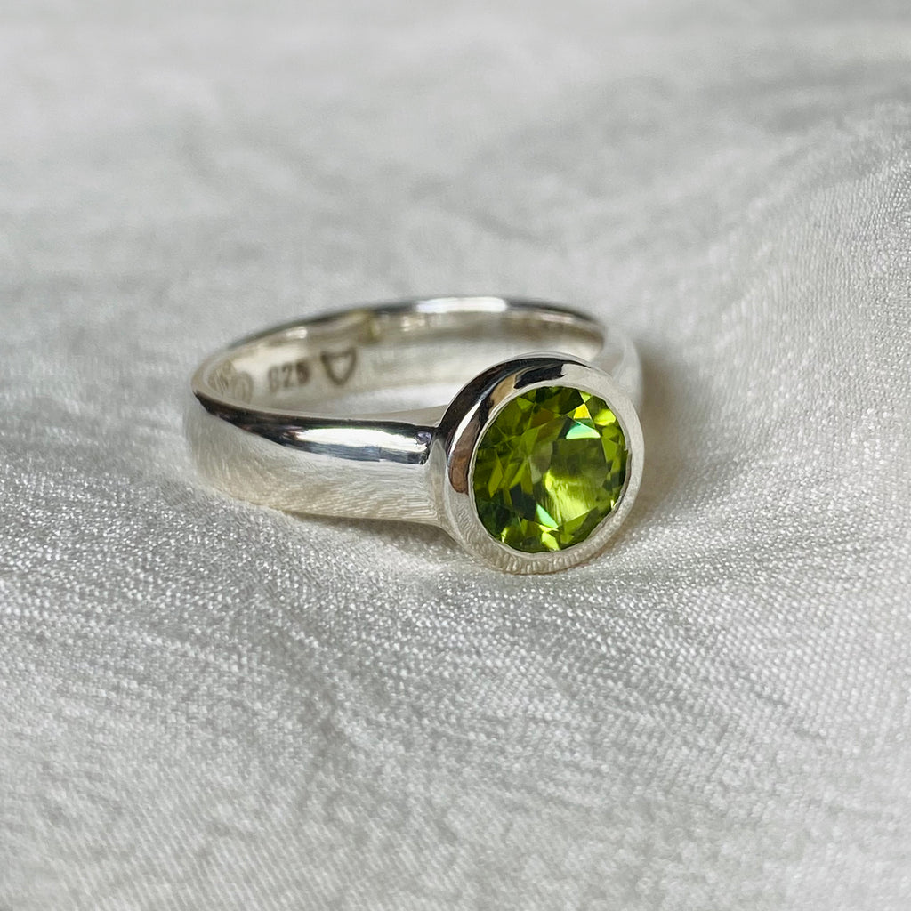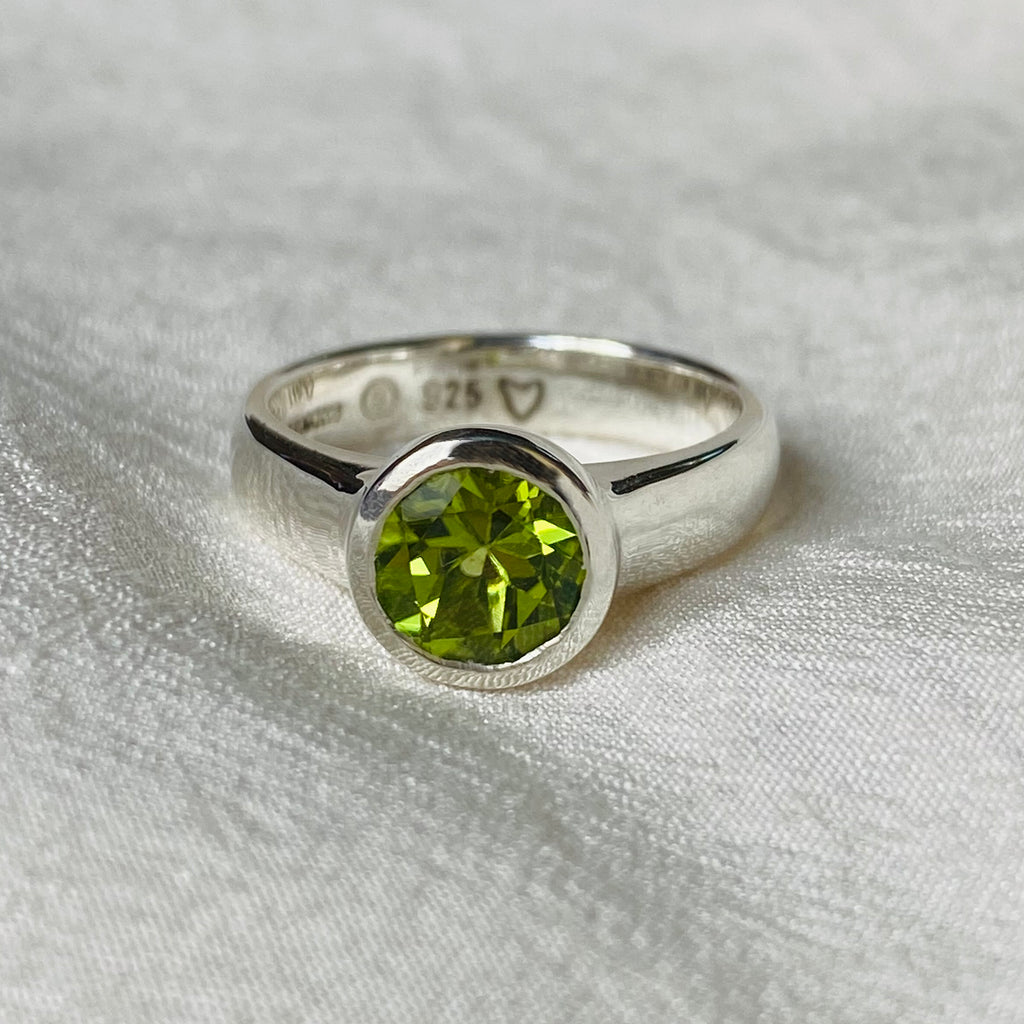 Beautiful simplicity. This ring features a beautiful round peridot gemstone in a bezel setting.