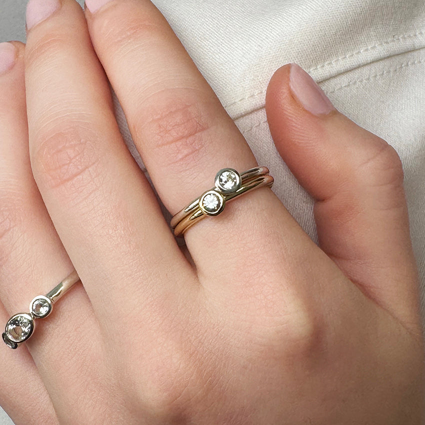 This dainty stacker ring features a stunning Flinders Island White Topaz on a elegant round band.
