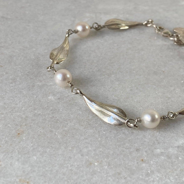 Gum Leaf & Freshwater Pearl Bracelet in Sterling Silver