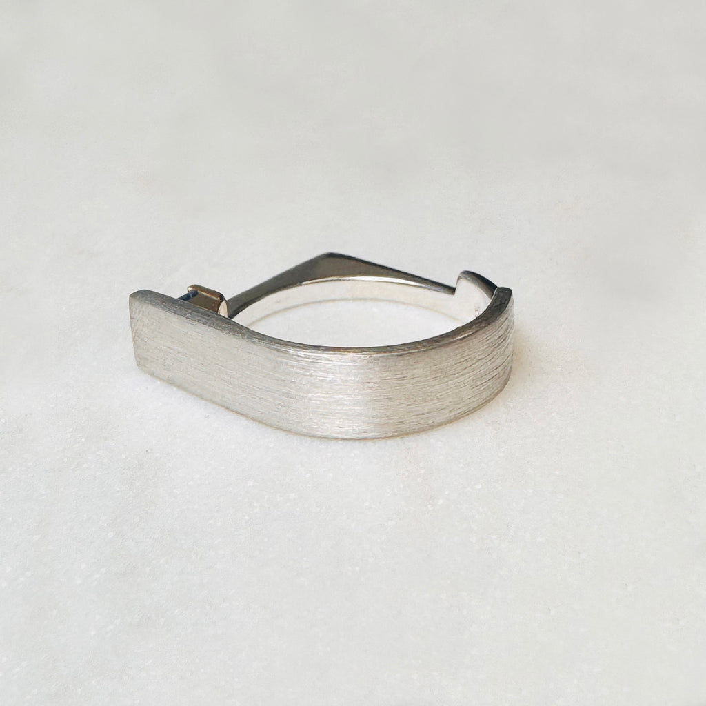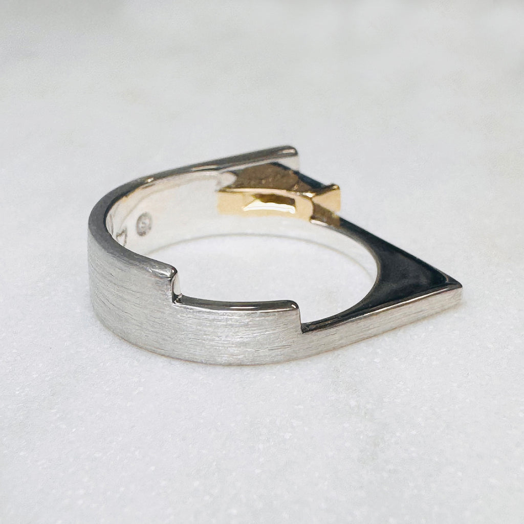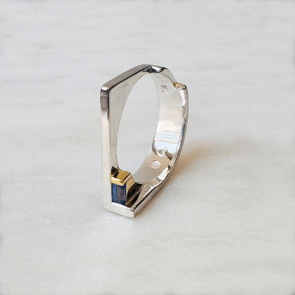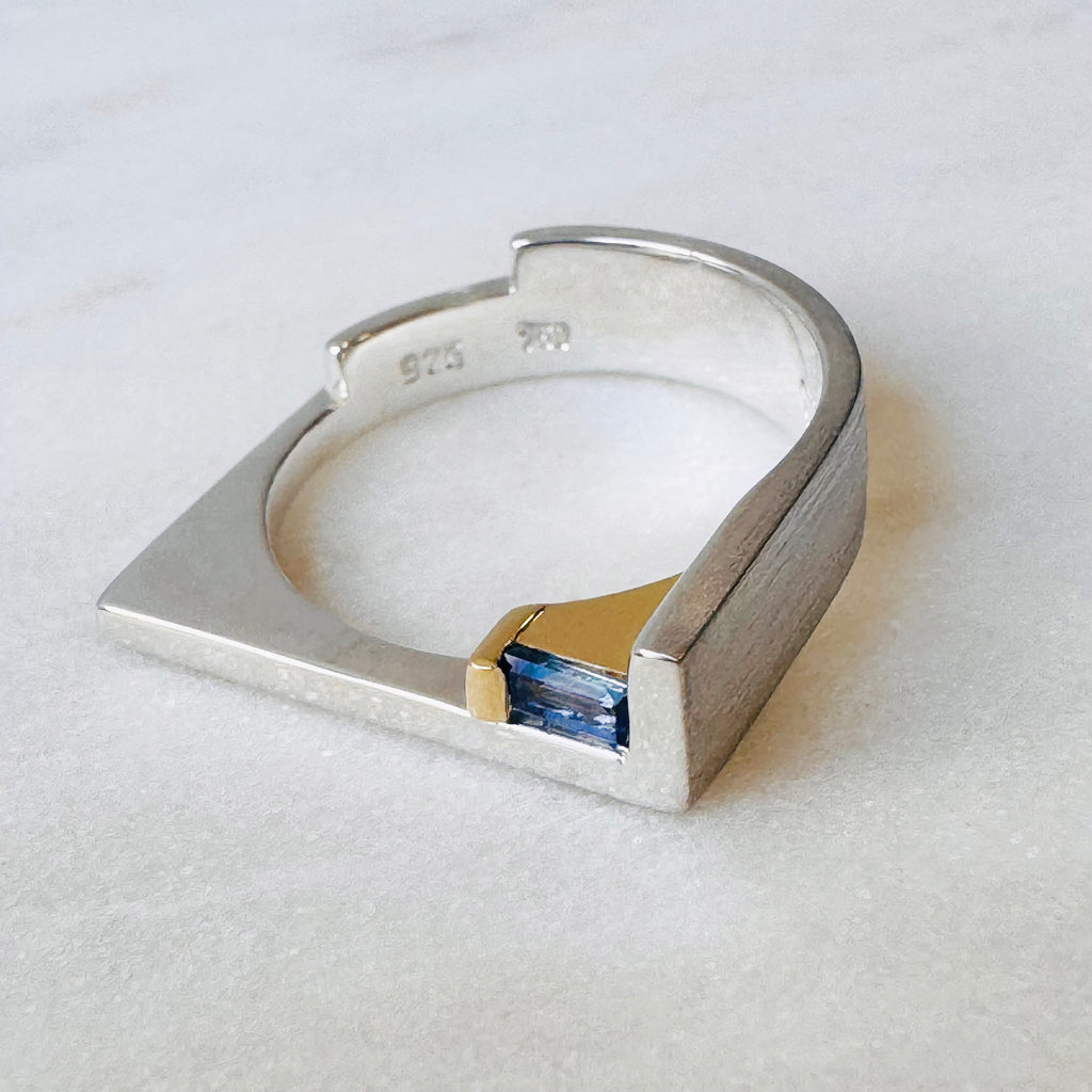 A contemporary design showcasing a stunning baguette cut blue sapphire set in 18ct yellow gold, on a sterling silver band. The metal has a polished finish in some parts and brushed finish in others, creating subtle contrast.