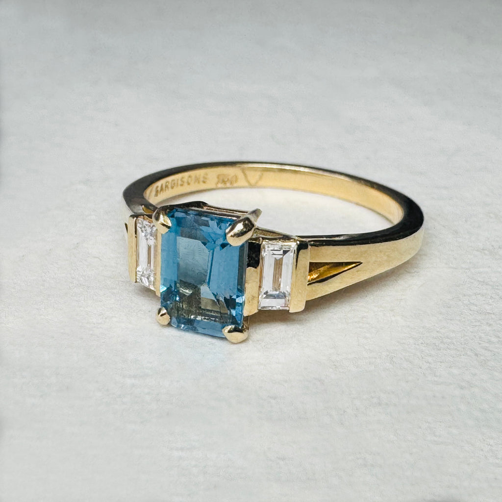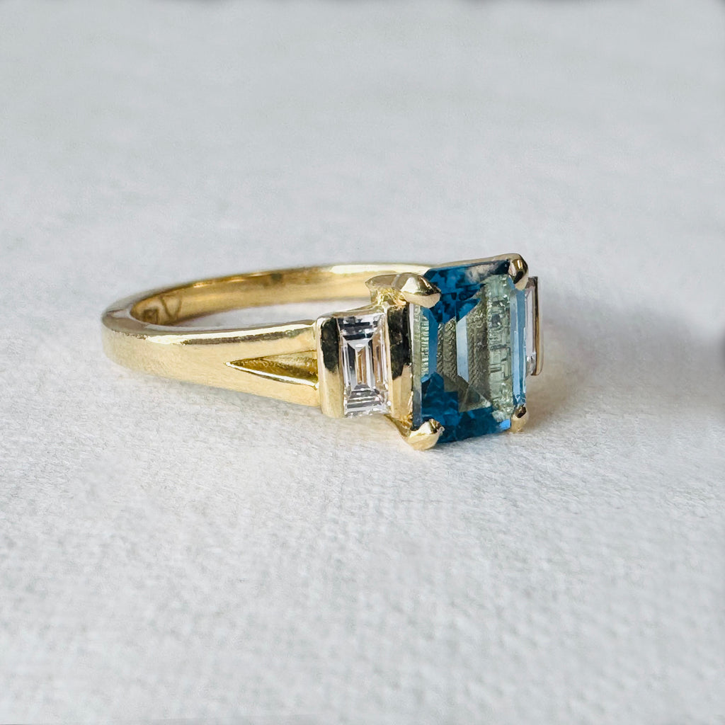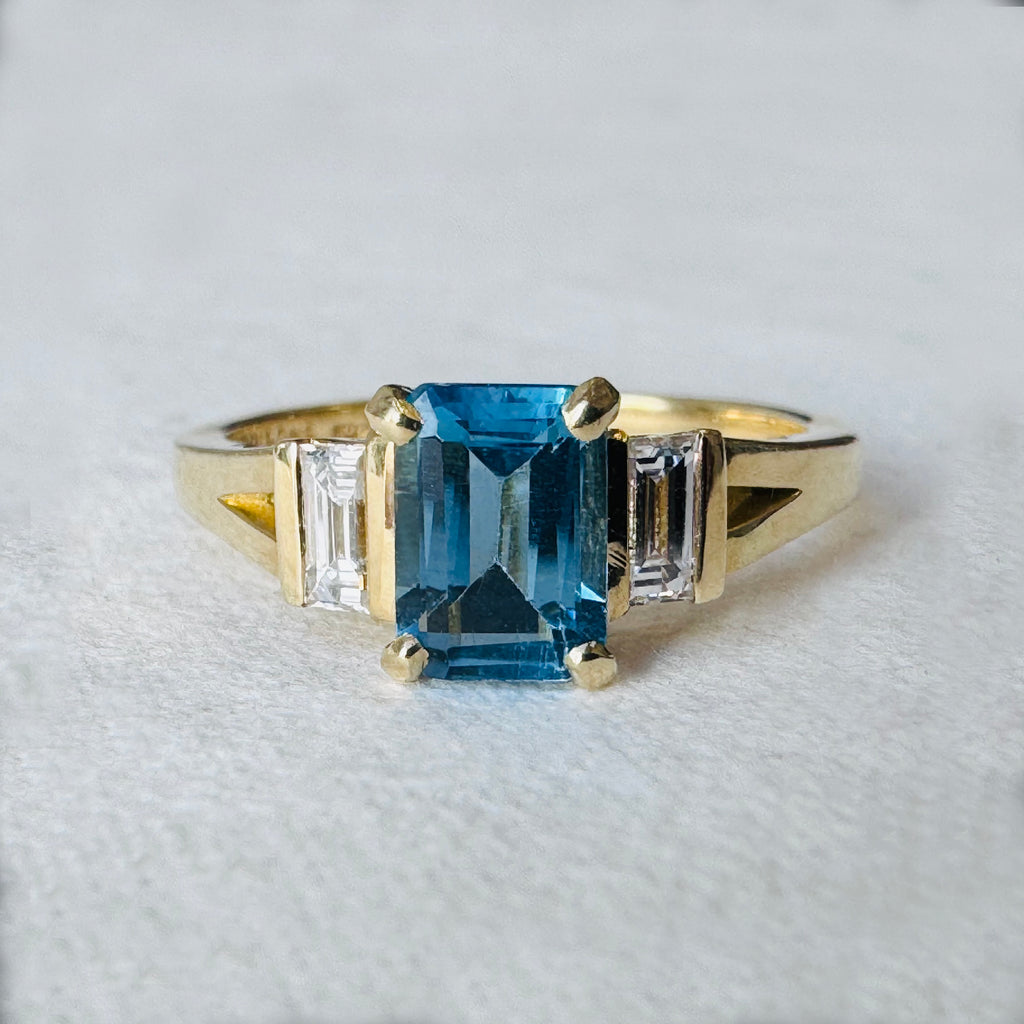 This stunning three stone ring features a 1.08ct emerald cut aquamarine and two baguette cut white diamonds.