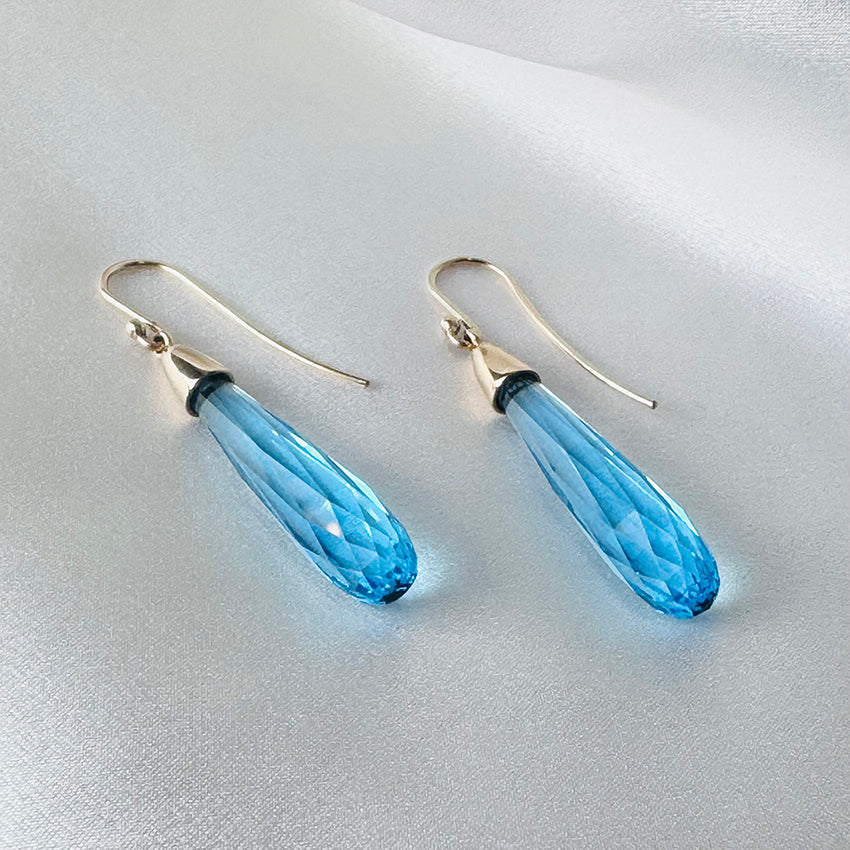 Stunning earrings featuring tear drop shaped briollete cut blue topaz gemstones.