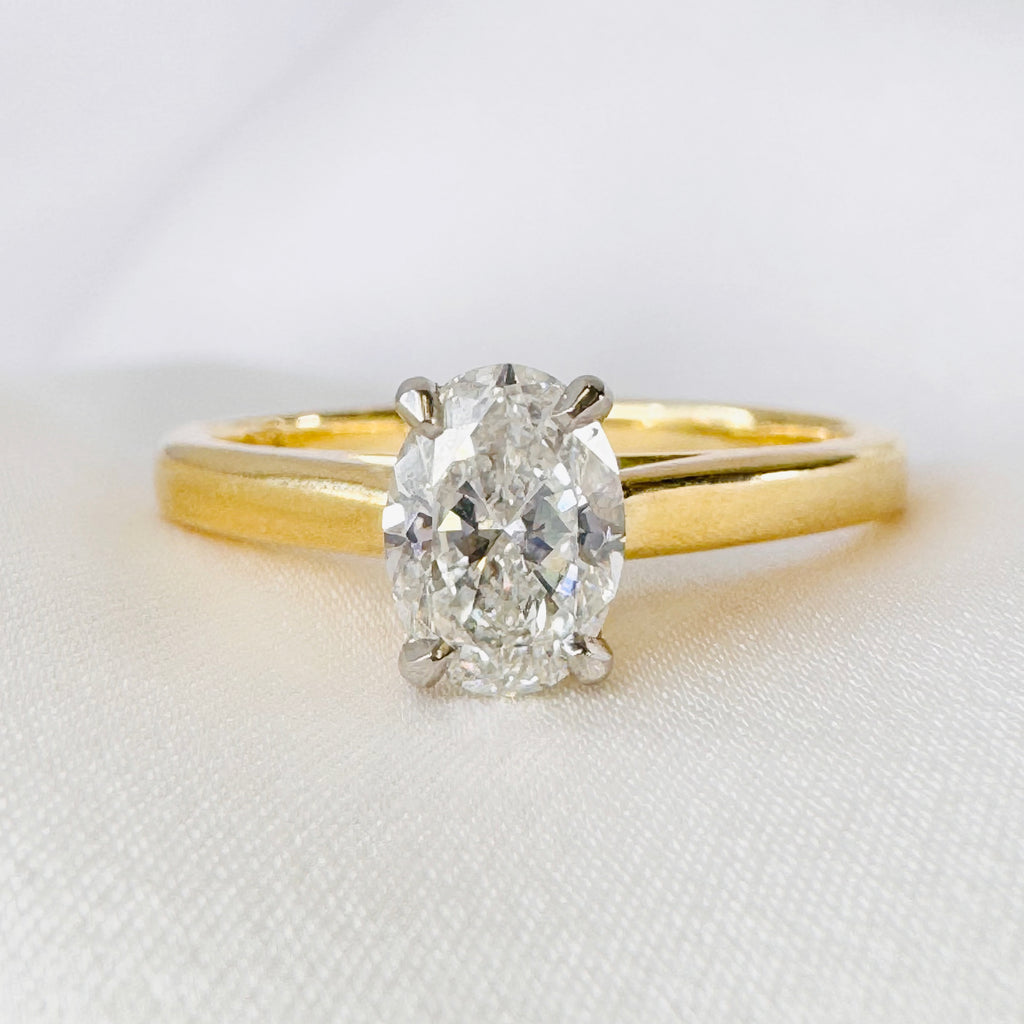 A 0.72ct oval diamond takes center stage in this classic, elegantly crafted engagement ring. Hand-selected and GIA certified, it shines brilliantly in platinum claw settings atop a slim 18ct yellow gold band - designed to highlight the diamond’s radiance while offering lasting strength and beauty.